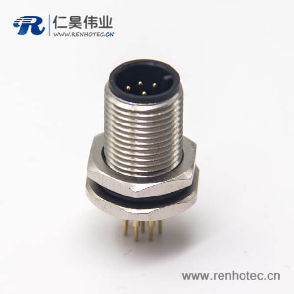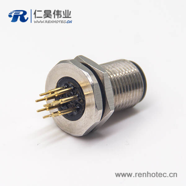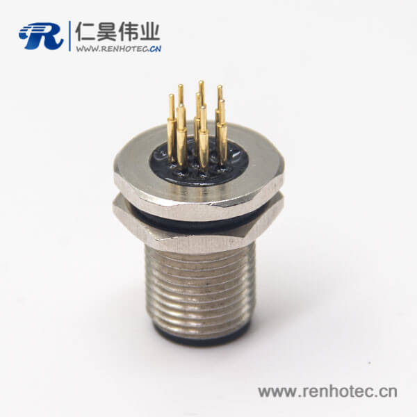 料号:RHT-634-1122 标签:M12,板端插座,A编码,8芯,直式,公头,前锁板,面板安装,插PCB板安装