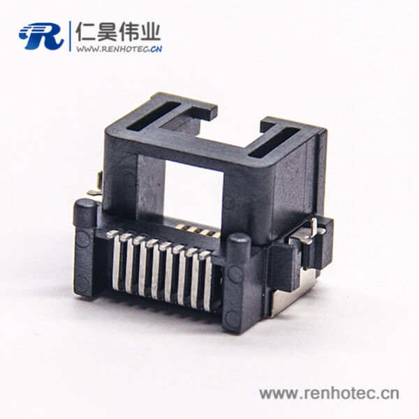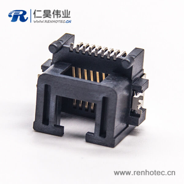 标签:RJ45插座,8P8C,单端口,1*1,弯式90°,触头镀金,沉板,贴板,PCB板安装,带屏蔽,不带灯,不带滤波